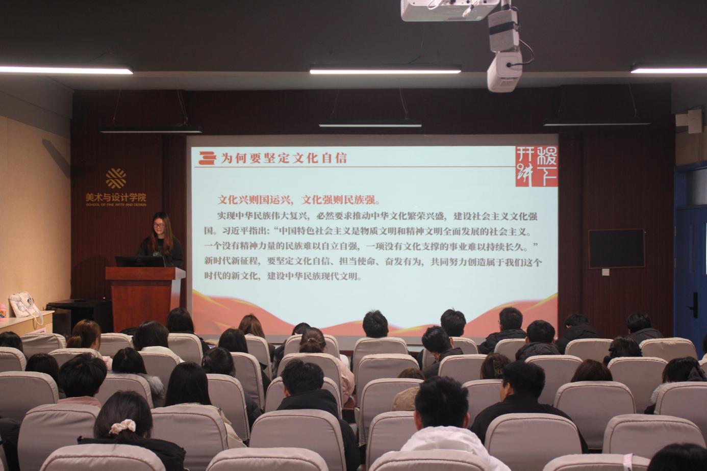 12月4日,王舒鑫、张淼鑫在美术学院开展以“坚定文化自信,弘扬中华文化”为主题的理论宣讲。她们围绕中华文化的深厚底蕴与时代价值两方面展开,并结合美术专业特色,探讨了传统文化在艺术创作中的现代表达,鼓励同学们从中华美学精神中汲取养分,自觉用艺术作品讲好中国故事。