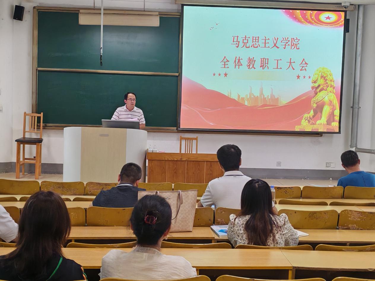 为传达学习学校党委四届七次全委(扩大)会议暨战略发展研讨会精神,安排部署新学期重点工作,9月11日下午,我院在三教102教室召开了全体教职工大会。会议由院长刘东锋主持,学院全体教职工参加。