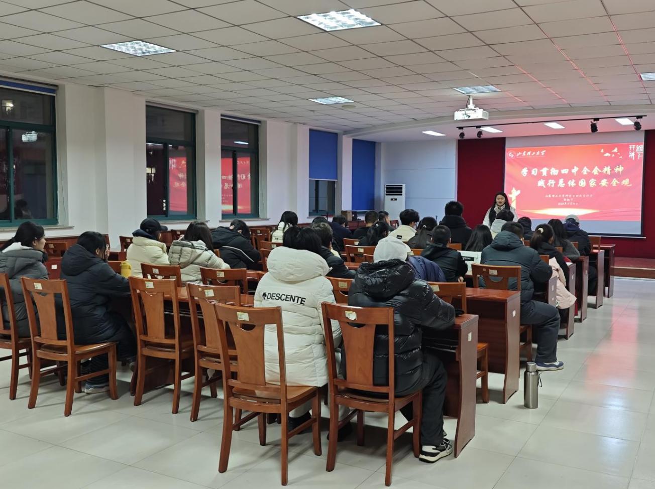 12月23日,郭翔宇在大学生艺术中心222会议室面向校团委学生骨干开展党的二十届四中全会精神宣讲活动。她围绕全会公报中“推进国家安全体系和能力现代化,建设更高水平平安中国”这一内容进行展开深入剖析,阐释了“坚持统筹发展和安全”的战略定位,以及健全法治体系、强化科技支撑、提升基层治理效能等具体路径。